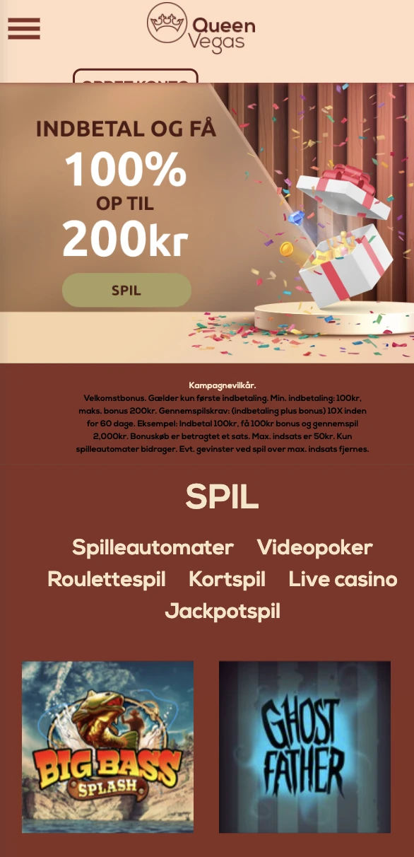 - Velkomst- og løbende tilbud tilgængelige på mobil, herunder QueenVegas bonus til Danmark: 100% op til 500 DKK plus op til 50 Mega Spins ved en indbetaling på 100 DKK.